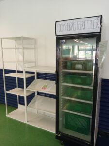 Essen und das noch gut ist und kann in den Kühlschrank oder in das mittlere Regal gelegt werden. In das linke Regal können auch weitere nützliche Gegenstände gelegt werden, solange diese noch in gut gebrauchbarem Zustand sind. Dabei gelten die Benutzungsregeln