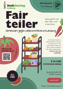 Der Fairteiler ist eine Verteilstation für übriggebliebene Lebensmittel (und gut gebrauchbare Alltagsgegenstände), die sonst nicht verbraucht würden. Alle können sich kostenlos und unverbindlich Lebensmittel herausnehmen oder hineinlegen (dabei gelten die Benutzungsregeln). Der Kühlschrank und die Regale sind durch die Ortsgruppe Freiberg des Vereins Foodsharing e.V. (https://beta.foodsharing.de/region/freiberg ) zur Verfügung gestellt und werden durch die AG-Umwelt in Stand gehalten.